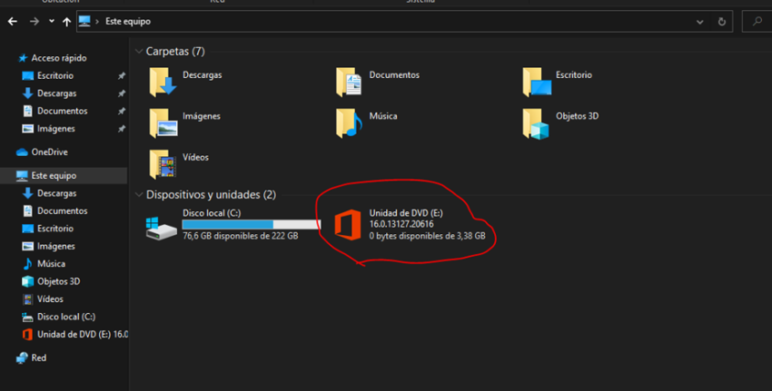 2. Haga clic en la “Unidad de DVD” con el logo de Office para abrir la carpeta donde está el instalador.